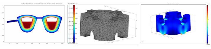 La simulation par éléments finis peut être utilisée afin d'optimiser la forme d'une pièce, d'en prédire les déformations et les contraintes ... et peut être appliquée à de nombreux domaines tels que le verre, les céramiques techniques, les matériaux réfractaires...